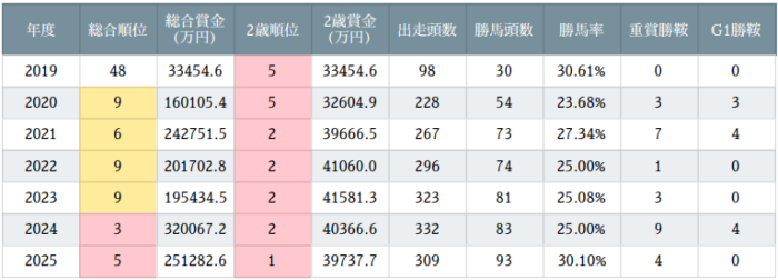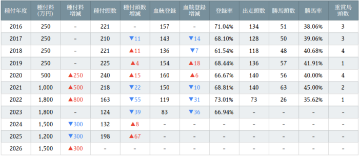 種付料250万円からのキャリアスタートながら初年度から高い人気を誇り、初年度産駒が2歳戦から活躍したことで、5年目には倍増となる500万円まで上昇。加えて二世代連続でクラシックホースを輩出し、6年目1,000万円→7年目1,800万円まで一気にジャンプアップ。年毎の成績にムラがあり、JRAサイアーランキングでもタイトルには中々手が届かなかったが、繁殖質がピークを迎えた23年産(7世代目)によって、遂に2025年度JRA2歳リーディングサイアーのタイトルを獲得した。