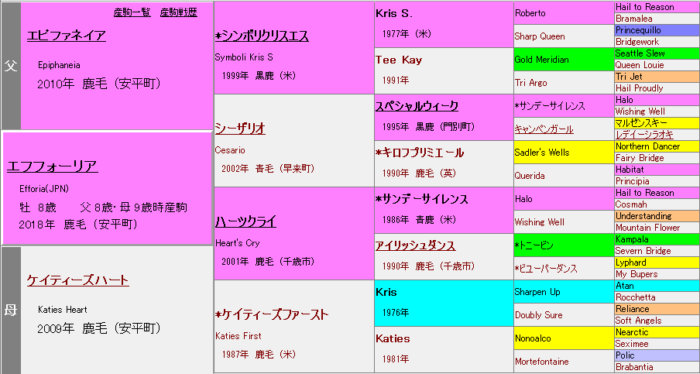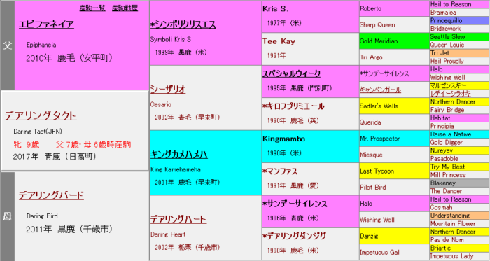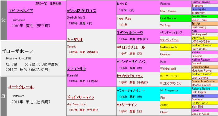 最近はダノンデサイル(母トップデサイルがBCジュヴェナイルフィリーズ-G1/USA 2着)・ブローザホーン(デュランダル×フォーティナイナー×Assert×Obeah)など、北米血脈の取り込み方は多様化している。仕組みはイマイチ腑に落ちないところがあるが、「非サンデーサイレンスクロス且つSeattle Slewクロス」はダノンデサイルを筆頭に、近年急激に数字を上げている注目の配合パターン。
