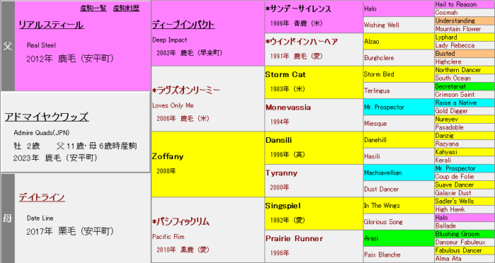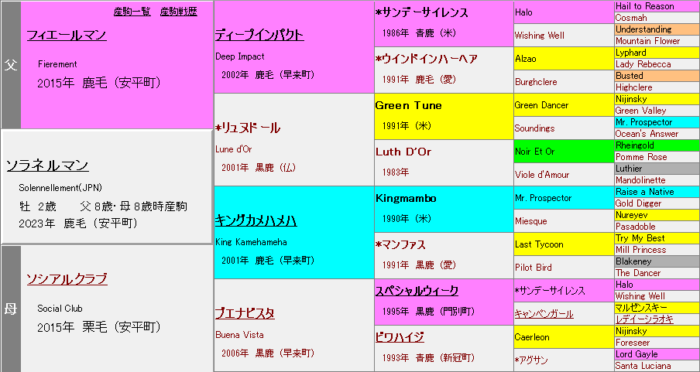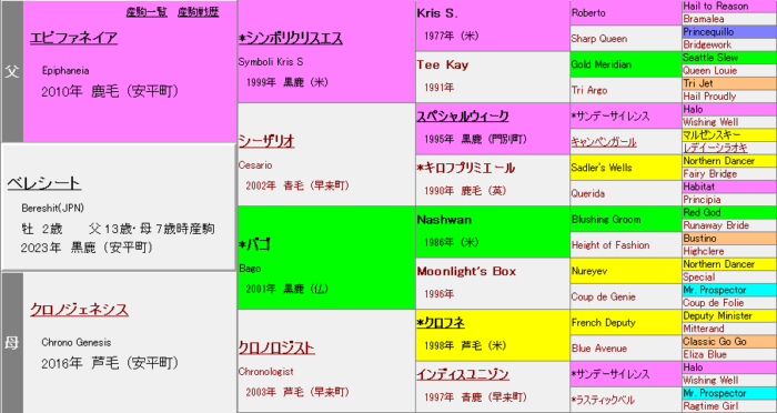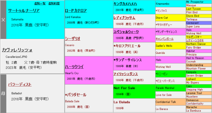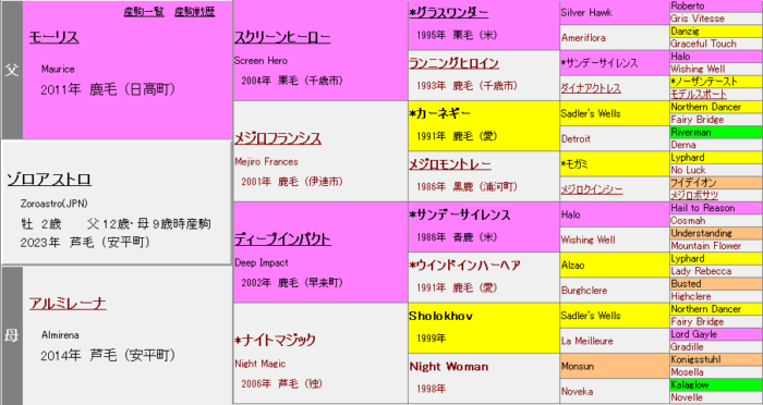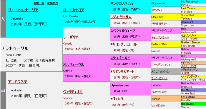 母アンドラステは中京記念-G3などJRA5勝の長めマイラー。「サートゥルナーリア×オルフェーヴル」はショウヘイと共通し、Nasrullah×Hyperion的方向に振るのは父産駒の成功パターン。Northern Dancer血脈が濃い父・母父の組み合わせなだけに、二代母ヴァリディオルがNorthern Dancerを全く引かない、綺麗な「3/4ND・1/4異系」になる本馬の方が構成としては褒めやすい。父産駒らしい溜めてのキレが持ち味だが、対応幅は広い短め中距離馬。この配合だけに多頭数で包まれた際の挙動は気になるところで、次走ホープフルSが試金石となる。内容次第では横綱昇格も。
