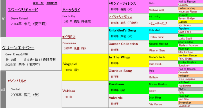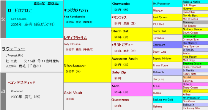 二代母Gold VaultはPomeroy(キングスビショップS-G1/USAなど重賞4勝)の半姉。母コンテスティッドはテストS-G1/USAなどG1競走2勝含む重賞3勝の北米マイラー。本馬はギベオン(金鯱賞-G2 他)の半弟にあたる。In Reality5×(5×6)・Storm Cat×Deputy Ministerの字面ならもっとガチガチのマイラーに出そうなものだが、この条件で新馬勝ちさせて「距離延長させてもよさそう」と言い切る辺りは流石友道師。個人的には素直にマイル路線で見たい。余談だが、本馬は23年セレクトセール当歳セッションにて香港のオーナーが2億円(税抜)で落札した後、24年セレクトセール1歳セッションに再上場、1億7,000万円(税抜)で落札されたという経歴を持つ。平田オーナーは重賞タイトルに中々手が届かないが、謎の巡り会わせで手にした期待の大物で遂に戴冠となるか。