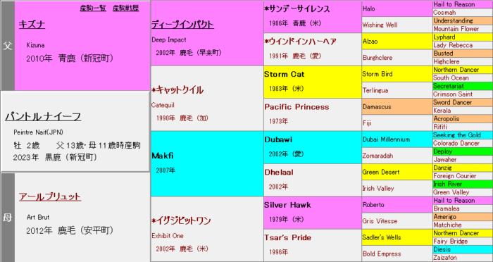 二代母イグジビットワンはパオロメッツァノッテ賞-G3/ITYなど重賞2勝。母アールブリュットは持込のマクフィ産駒でJRA4勝、メートルダール(中日新聞杯-G3)の半姉。本馬はパラレルヴィジョン(ダービー卿CT-G3 他)の全弟にあたる。「キズナ×Green Desert×Sadler’s Wells」はこの兄弟の他にバスラットレオンなどと共通し、パワーマイラーに寄る配合。兄は芝中距離でキャリアを重ねた後、4歳秋にダートマイルでOP入り、芝に戻してマイルでL・重賞を連勝と紆余曲折を経て大成。本馬は兄ほどの硬さはないもののタイプとしては長めマイラーくらいの印象で、今後は距離延長への対応が鍵となる。