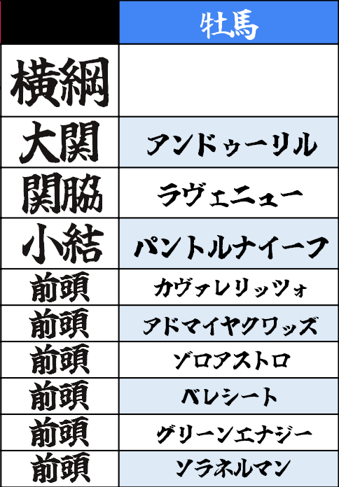 関脇はラヴェニューとする。以下、勝ち上がり診断(評価A)より引用。