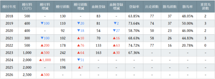 500万円でスタートした種付料も一時は300万円まで低迷したが、初年度産駒イクイノックスの活躍により22年には初年度水準まで回復し、種付頭数もキャリアハイを更新。翌23年には種付料1,000万円、24年は更に倍の2,000万円に到達。勢いは止まらず、26年は産駒イクイノックスと共に同年本邦最高額の2,500万円まで上昇している。既に後継種牡馬候補が続々誕生しており、今後は父祖として大きな影響力を持っていくだろう。