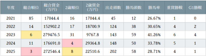 産駒は芝中距離を主戦場としながら、ダート・短距離・マイルなどのカテゴリでも上級馬を輩出。2025年は僅か5世代202頭の出走でJRAリーディング3位に食い込んでおり、AEIの高さは他の追随を許さないほどハイレベル。現段階でのJRA重賞馬は11頭中8頭が牡馬で、G1級優勝馬4頭はいずれも牡馬。牝馬偏差値を見ても、コルトサイアー傾向が強い種牡馬と言える。これは父ブラックタイドにも見られたもので、直仔世代・孫世代ともに牝馬優勢であるディープインパクトのサイアーラインとの違いは興味深い。「牝馬的しなやかさ」のディープインパクトに対し、「牡馬的持続力」のブラックタイドということなのだろう。