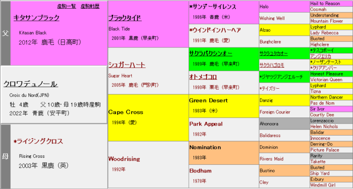 また、産駒芝G1馬3頭はそれぞれ重厚な欧州血脈をベースにしている点にも注目したい。主だった共通する構成要素を挙げると、Nureyev≒Sadler’s Wellsトニービン~HornbeamWorden≒Le Fabuleux辺り。欧米のスピード・パワー・スタミナを満遍なく取り込む『強欲な配合』で最大打点を出しているとも言えるか。