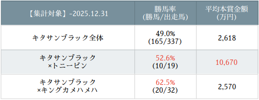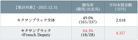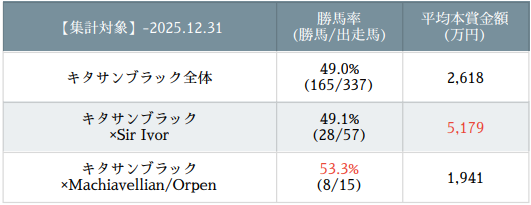 キングカメハメハ(Nureyev内包)との配合も抜群のアベレージを誇り、ここでも「ライバル(ドゥラメンテ)の血」がもたらす影響を感じる。今後増えるであろうドゥラメンテ肌との配合からも、大物が出るのではないかと期待。