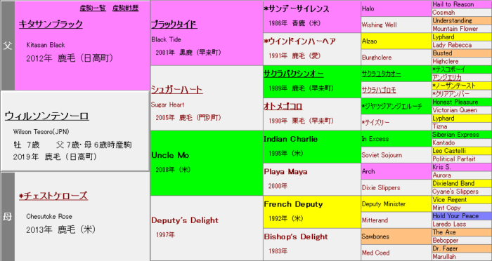 二代母オトメゴコロはCee’s Tizzy(Tiznowの父)の半妹で、JRA4勝のスプリンター。父母ともに北米産でありながら、Stafaralla=Sind6×6など重厚な欧州血脈のクロスを複数持つ点が趣深い。母シュガーハートは未出走も、繁殖としてはまずまず優秀。中央出走産駒9頭中5頭が勝ち上がり、本馬の他にシュガークン・ショウナンバッハ・エブリワンブラックが重賞好走実績を持つ。本馬は父の3世代目産駒、母7歳時の3番仔にあたる。