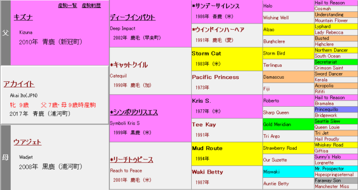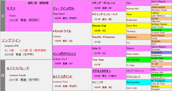 初期G1馬のアカイイト・ソングラインは共に母父シンボリクリスエス。シンボリクリスエスはKris S.やSeattle Slewといった「Nasrullah×Princequillo」血脈を内包するため、ディープインパクトと好相性。また、Storm Catとの組み合わせでは、Nasrullah×Princequillo・Crimson Satan・Tom Fool≒First Rose・Eight Thirtyなどが共通。ロードカナロア・リアルスティールなど、他のStorm Cat内包種牡馬とも軒並み好相性となっている。シンボリクリスエスはNorthern Dancerを引かないため、母父に置くことで「3/4ND・1/4異系」の好形になるのも成功要因の一つだろう。「ライバル(エピファネイア)の血」を取り込んだ配合である点も示唆に富んでいる。ソングラインはMachiavellian、アカイイトはMiswakiと、肌に入って優秀なスピード・機動力を伝える血を母系に抱えることで、このニックスをより強調させている。