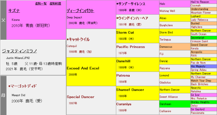 産駒初の牡馬G1馬かつ初のクラシックホースであるジャスティンミラノは、母父Exceed And Excelを経由してLomondを内包する。これはファインルージュやライトバック(同母父)と共通し、抜群の長打力を誇る配合。Lomondは前述シンボリクリスエスのポイントとして挙げたSeattle Slewの半弟。その母My Charmerは、「Nasrullah×Princequillo」血脈のPoker産駒かつStriking=Busher3×3を持つ名繁殖だ。ジャスティンミラノの母マーゴットディドはTom Fool6×5で、二代母Special DancerはSir Gaylord4×3。キズナ牡馬らしからぬしなやかな体質は、Darshaanの影響も感じさせる。