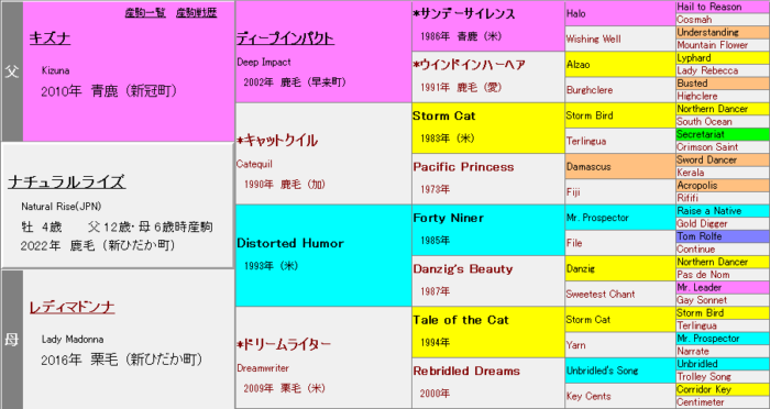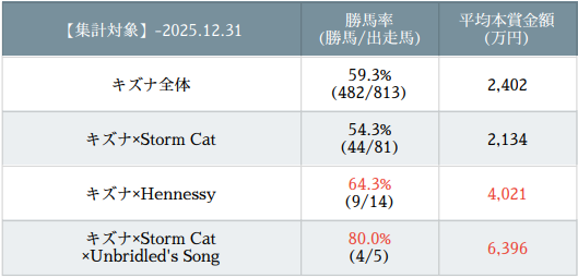 所謂コントレイル配合を再現するUnbrided’s Songとの組み合わせも当然優秀だが、ナチュラルライズ・ショウナンラプンタを筆頭に、Storm Catクロスを併せ持つ方が何故か数字は良く、ディープインパクト用の繁殖が割とそのまま機能している。
