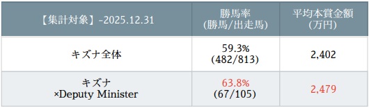 Deputy Ministerを用いて、Storm Catの「War Relic≒Eight Thirty≒Good Example」血脈を力馬っぽく弄る配合も単純ながら侮れず、ダブルハートボンド・クイーンズウォーク・テリオスベルなど多くの活躍馬が出ている。産駒ダートG1級優勝馬2頭に共通するのは、母系が軽薄な北米Mr. Prospector系主体に構成されている点。ハナからダート路線を目指すのであれば、「母系の重厚感」的要素は案外不要なのかもしれない。