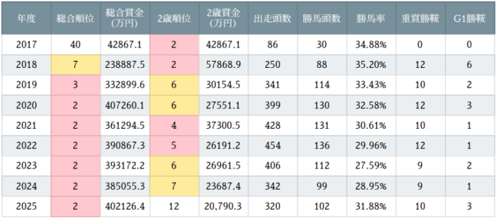 後継種牡馬の産駒が既に結果を出し始め、自身は種付料・種付頭数共に減少傾向と、種牡馬としてのキャリアは晩年に入りつつある。それでもサンデーサイレンスを持たない使い勝手の良さから根強い支持を受けており、繁殖質についても極端な低下は見られない。JRAサイアーランキングでは、20年から25年まで6年連続2位。もう一押しに欠けるのは事実だが、安定感は魅力だ。
