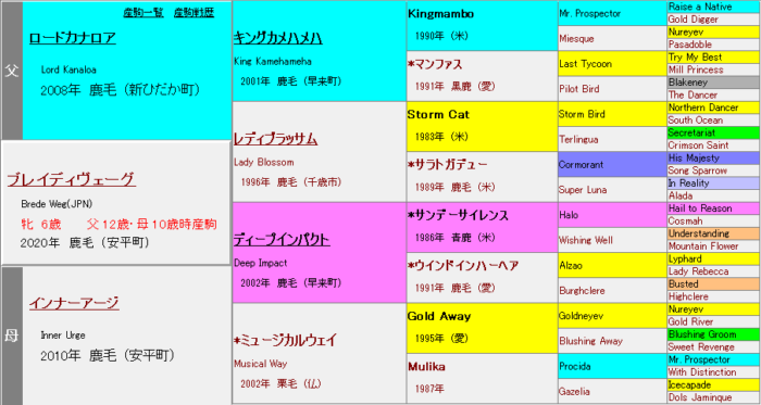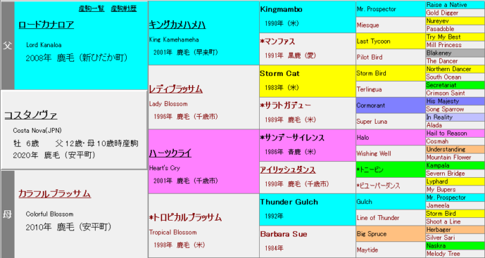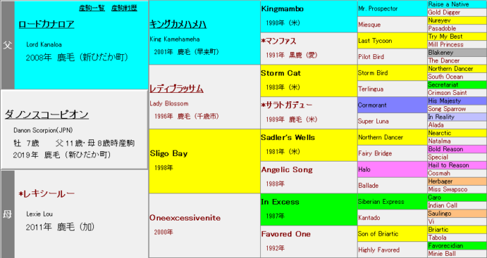 牝祖Somethingroyalは2頭の大種牡馬Sir Gaylord・Secretariatを輩出した名牝。二代母サラトガデューはガゼルH-G1/USAやベルデイムS-G1/USAを制したエクリプス賞最優秀3歳牝馬。母レディブラッサムは芝ダートで中央5勝を挙げた上級スプリンター。繁殖としてもまずまず優秀で、中央出走産駒9頭中5頭勝ち上がり、本馬を含む3頭が2勝以上を挙げている。本馬は父の3世代目産駒、母12歳時の6番仔にあたる。