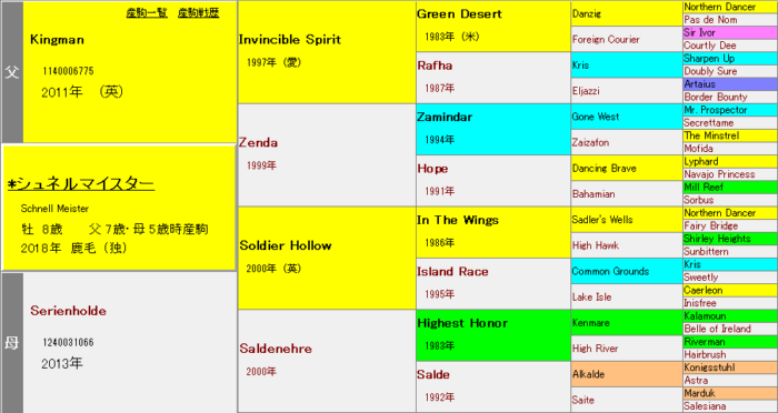 比較的安価な新種牡馬枠としてはシュネルマイスターを推したい。G1タイトルはNHKマイルCのみに終わったが、父は超良血の欧州トップサイアーであるKingman、母は独Sラインのオークス馬であるSerienholdeというケチのつけようがない美しい血統構成。競走成績以上に種牡馬として成功する可能性は高いと見ている。
