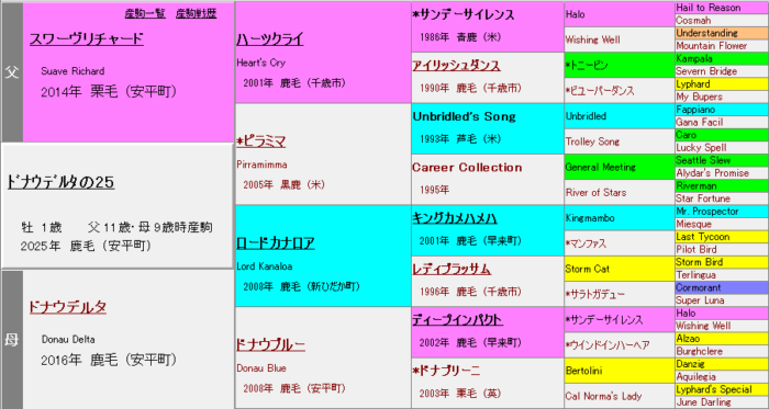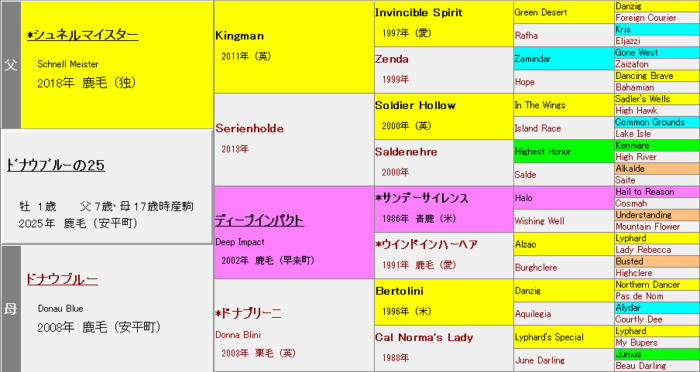 注目の募集想定産駒はドナウデルタの25(牡)。初仔の半姉はサンデーTC募集、2番仔の半姉は何故かキャロットC募集。今年に関してもサンデーTC募集には掛からなかったため、キャロットC募集の可能性がある。牝系に関しては、シュネルマイスター項で紹介したドナウブルーの25を参照。「スワーヴリチャード×ウインドインハーヘア×Danzig」はレガレイラ=アーバンシックと共通するニックスで、「ディープインパクト×Storm Cat×Unbridled’s Song」を意識したアウトライン。この世代のドナブリーニ牝系は激アツ。