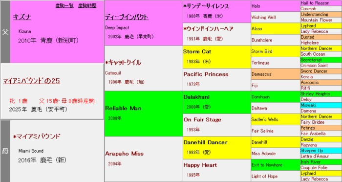 注目の募集想定産駒はマイアミバウンドの25(牝)。半姉2頭はオータムセール上場・行先不明と、クラブ募集に掛かるかは正直何とも言えないところだが……。母マイアミバウンドは二代母Arapaho MissとVRCオークス-G1/AUSを母娘二代制覇。「キズナ×Danehill×Shirley Heights」は当時の最活躍馬であるジャスティンミラノを強く意識した配合となっている。「Alzao=Light of Hope」も印象的で、如何にもキレるキズナ牝駒に出そう。