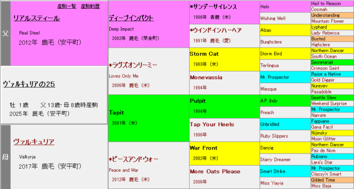 注目の募集想定産駒はヴァルキュリアの25(牡)。母は所謂Our Blood要件(JRA3勝以上)を満たしており、初仔の半兄はキャロットC募集。「とびだせとねっ仔」掲載馬ではないものの、順当なら本馬もキャロットC募集と思われる。二代母ピースアンドウォーはアルシバイアディーズS-G1/USA制覇で、母ヴァルキュリアはJRA4勝。「リアルスティール×A.P. Indy」はフォーエバーヤング・ルシュヴァルドールなどと共通する打率の高い配合。母自身が「Tap Your Heels≒Rubiano」というイカしたニアリークロスを内包し、繁殖として非常に魅力的。