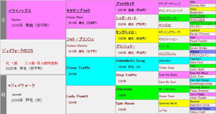 2頭目はジェイウォークの25(牝)。初仔の半兄はセレクトセール上場、2番仔の半姉はシルクHC募集で、本馬も半姉と同じくシルクHC募集と予想。母ジェイウォークはBCジュヴェナイルフィリーズ-G1/USAなど重賞3勝のエクリプス賞最優秀2歳牝馬。こちらは母父キングヘイローを活かしたパターンで、リフレーミングやカフェファラオ=ルクソールカフェなどに見られる「Lady Be Good≒Charedi」がポイント。初年度産駒には思ったほど見られなかったが、前述の産駒イメージからしても、Unbridled’s Songとの配合はニックス候補の最右翼だろう。半兄姉は下馬評ほど走っていないが、本馬が母の評価を高める一頭になるのでは。