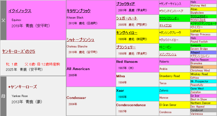 注目の募集想定産駒は2頭挙げたい。1頭目はヤンキーローズの25(牝)。既にサンデーTCにて募集予定であることが発表されている。母ヤンキーローズはATCサイアーズプロデュースS-G1/AUSなどG1競走2勝の豪最優秀2歳牝馬・3歳牝馬。本馬はリバティアイランド(牝馬三冠)の半妹にあたる。「トニービン×Strawberry Road」は半姉のほかにドウデュース・ヴァレーデラルナ・ハーパーなどを輩出したニックスで、所謂「ライバルの血」配合にもなる。ノーザンファームを中心に相当数試されており、自信のほどが窺える。牝馬三冠姉妹制覇を狙いたい好素材。