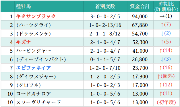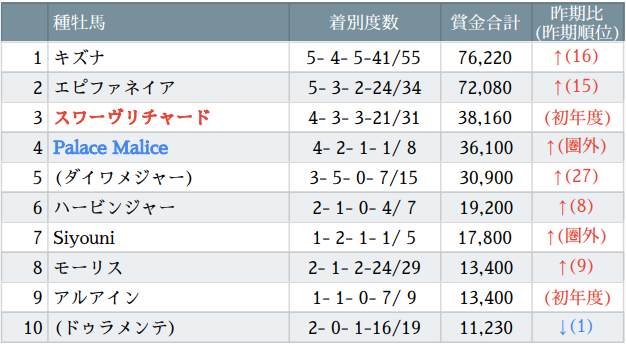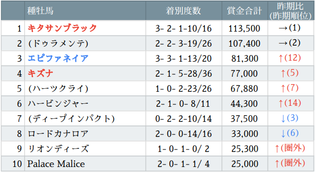 続いて、同期間が所謂POG集計対象期間となる、2021年産駒のJRA重賞種牡馬成績。昨期比欄を見ても分かる通り、昨年上位馬の多くが姿を消してクリーンナップが大きく入れ替わった。