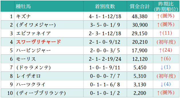 この世代で特に活躍が目立った種牡馬は、全体3位・NF限定4位のスワーヴリチャード。この世代が初年度産駒にあたる新種牡馬で、牝馬ながらホープフルSを制し牡馬クラシックでも健闘したレガレイラを筆頭に、4頭のJRA重賞優勝馬を輩出。仕上がりの早さを活かし、下馬評を覆す好成績を残した。