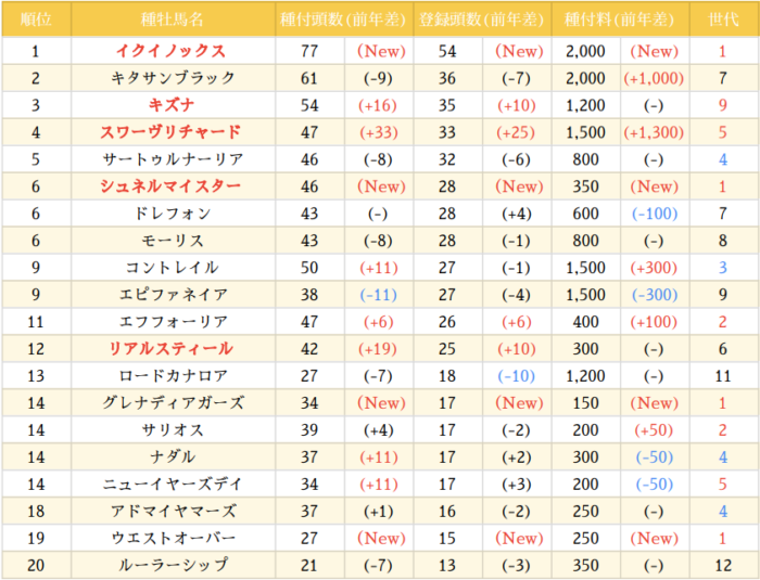 3位キズナ(種付54頭・登録35頭)は種付料こそ前年据え置きの1,200万円であるものの、種付+16頭・登録+10頭と頭数に関しては前年から大きく伸ばす結果。初年度産駒の成績を受けて供用5シーズン目に優遇されるのと同様に、5世代目産駒の成績を受けて供用9シーズン目に更に優遇されるのは流れとして自然である。加えて、同父同郷のコントレイルが様子を見られる3世代目に入ったことも追い風か。