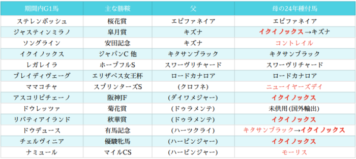 因みに、前項の成績対象期間内にG1を優勝したノーザンファーム生産馬14頭の母について、同年の種付馬をまとめたのが上表。父が2024年種付当時現役種牡馬である6頭中5頭は、G1優勝産駒の父がそのまま流用されている。「捻らずG1馬の全弟妹をつくる≒その時点での成功例をそのまま再生産する」のが、ノーザンファームの基本方針と考えてよいだろう。一方、父が当時引退済の種牡馬(プライベート供用含む)である=成功例の全弟妹をつくることが不可能な繁殖7頭の内4頭には、イクイノックスが配されている。これだけでも本馬に対する期待度の高さが知れるところだ。
